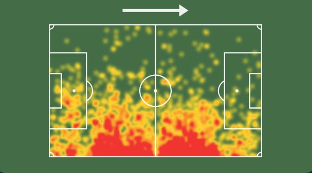 It’s pretty simple to categorize Yamane’s playstyle; he’s an attack oriented full back. When watching his highlights, you see him dribbling into the final third, crossing the ball from wide postions, and shooting the ball often. Take a look at his heatmap from this past season in Japan.