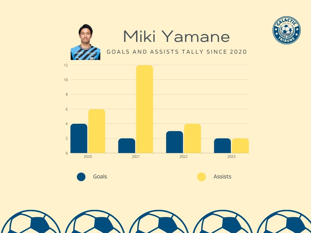 The best year of his career was 2021 where he recorded two goals and 12 assists to lead Kawasaki to back-to-back league titles. In 133 league games with Kawasaki, Yamane has recorded 11 goals and 24 assists.