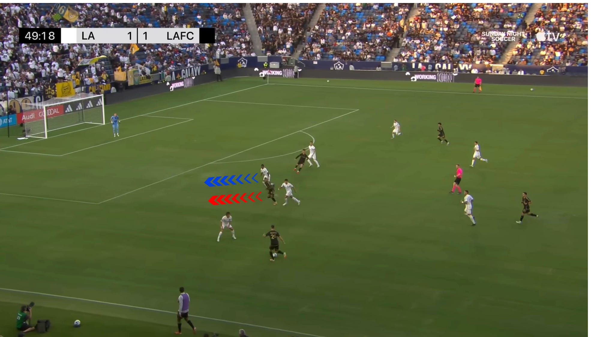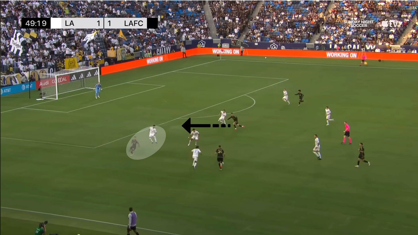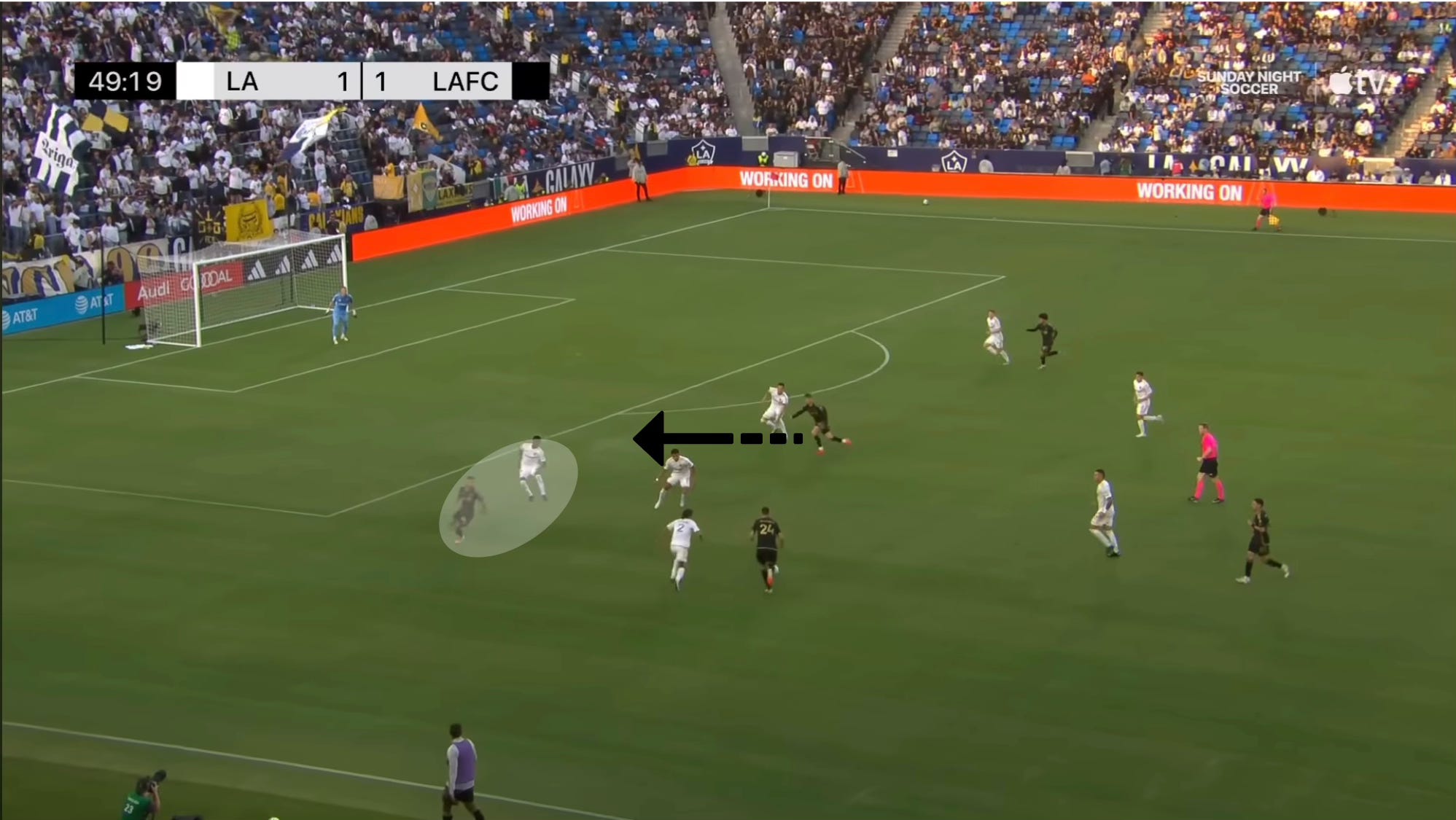 Against LAFC, the Colombian tracks Denis Bouanga’s wide run aggressively, which leads to Nathan Ordaz finding a lane in the box to receive the ball and score.